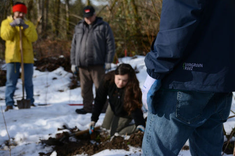 Alex and Maya explained to the volunteers what the game plan for planting in the snow would be. The four species we had were all bare root plants. That means that they come rolled in strands with long, spaghetti like roots. The key to helping them establish roots at a young age is to make sure the roots are spread out and untangled. You want the holes to be about 6 inches deep, with the bottom of the roots just brushing the bottom of the hole.